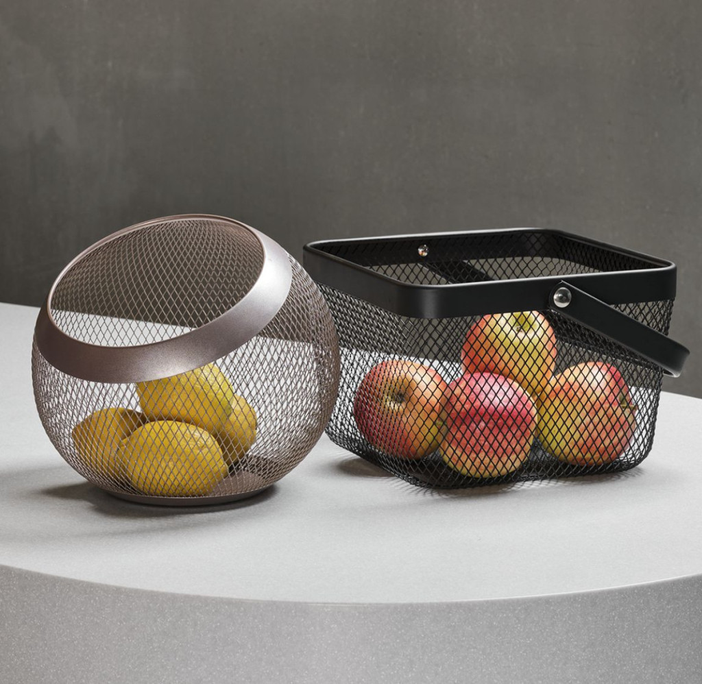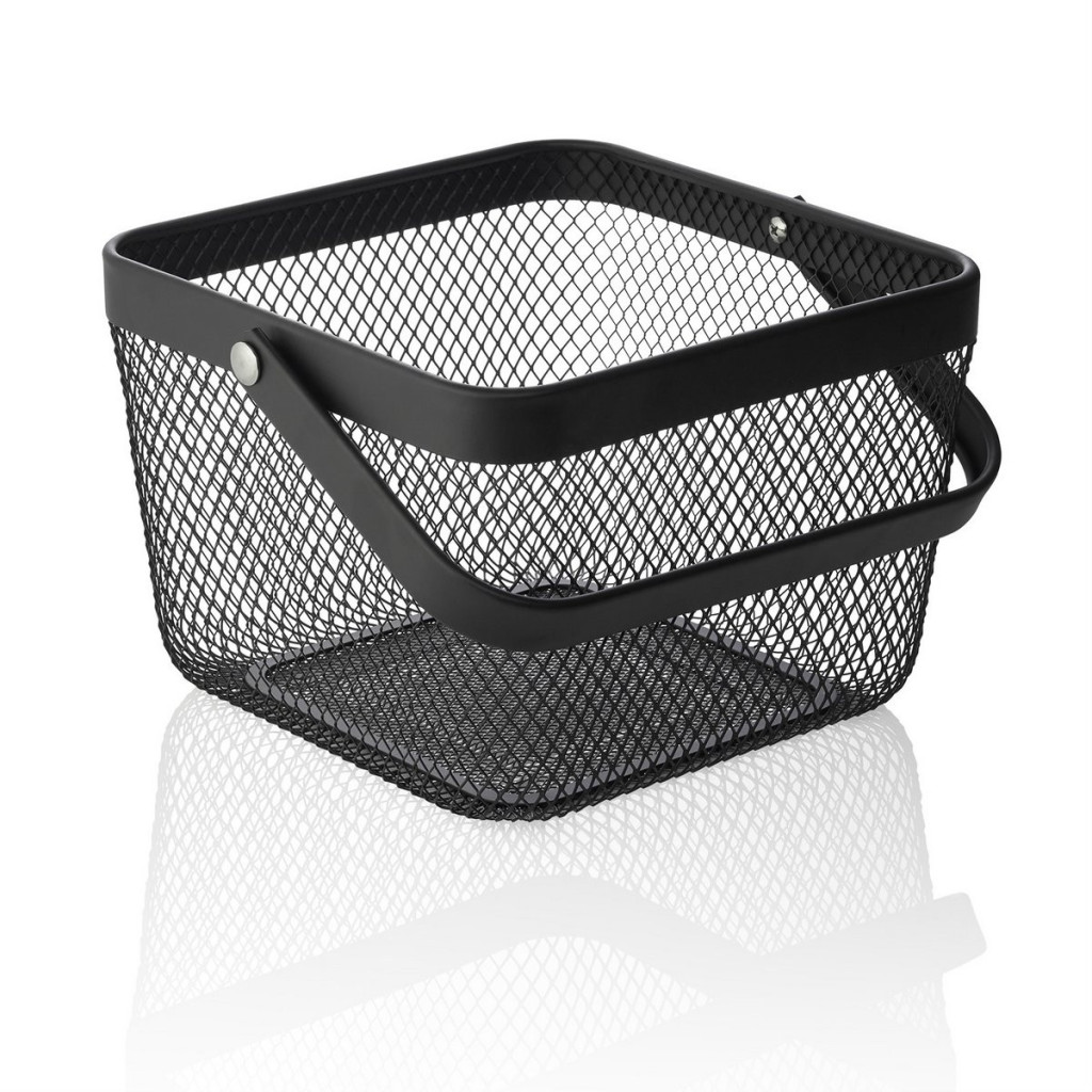 Modern, négyzet alakú fémkosár porszórt fekete kivitelben, 24x24 cm méretben. Minimalista design találkozik a praktikus funkcionalitással.