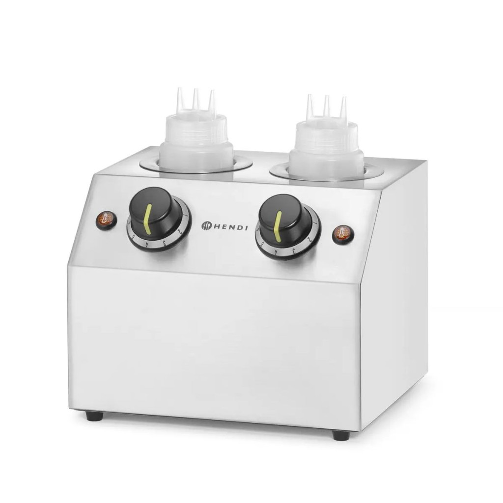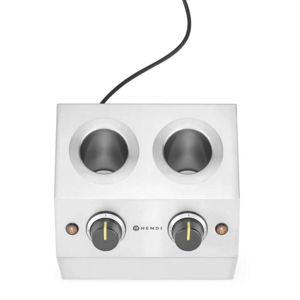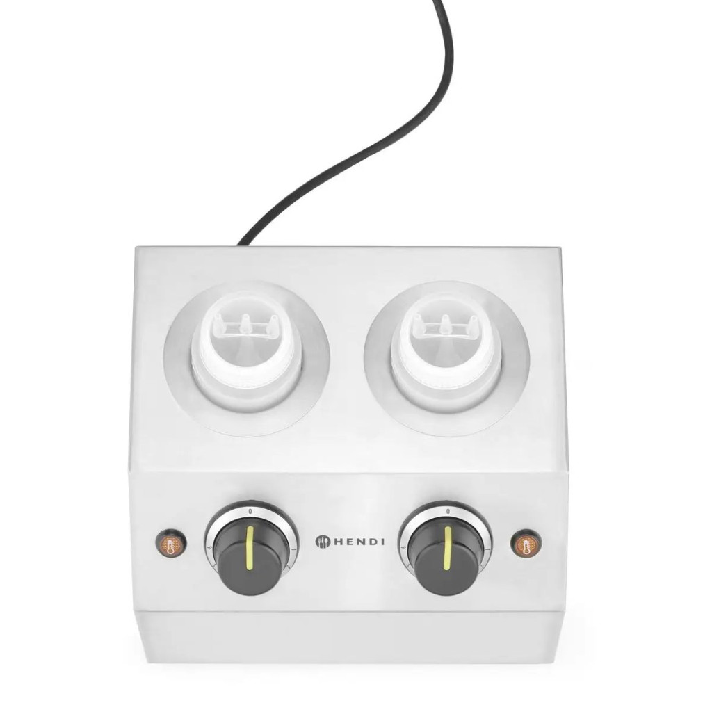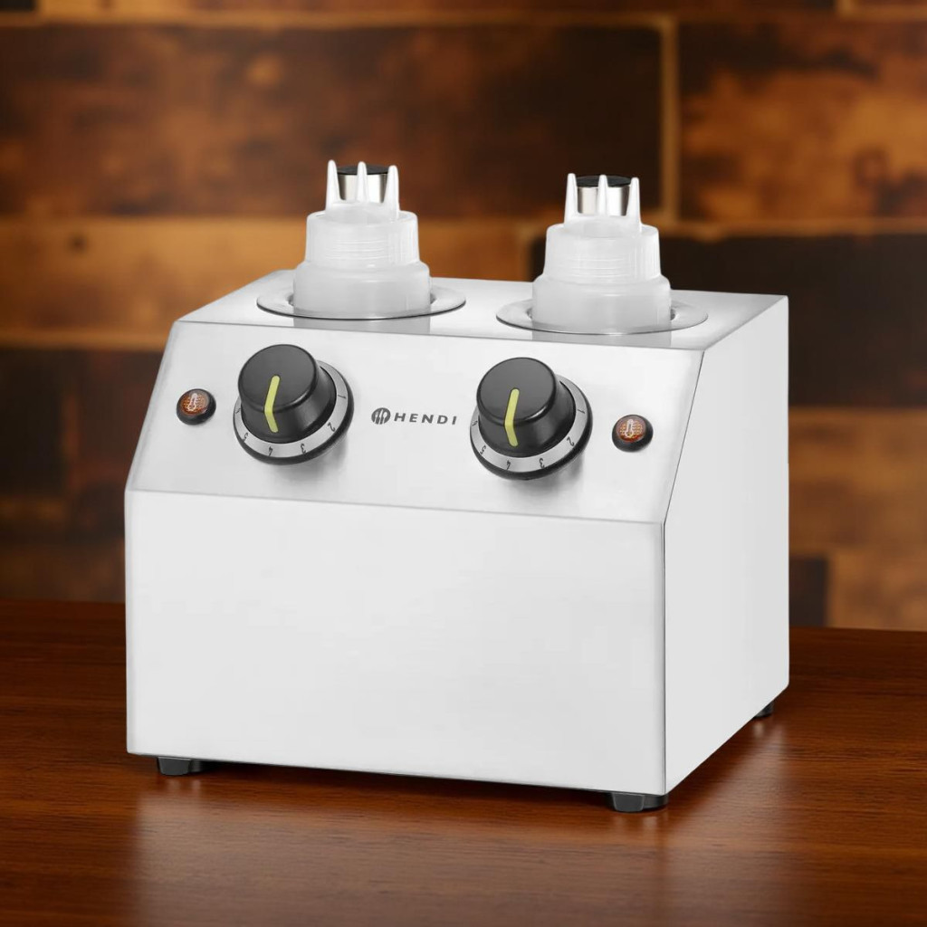 A HENDI szószmelegítő tökéletes eszköz a csokoládé és más meleg szószok megfelelő hőmérsékleten tartásához, hogy könnyen átönthesse azokat fagylaltra, kreppre és más desszertekre. Egyszerűen helyezze az üveget a melegítőbe, és a tartalmát a beállított hőmérsékletre melegíti fel. Módosítsa a hőmérsékletet, hogy a csokoládé vékonyabb vagy vastagabb legyen.