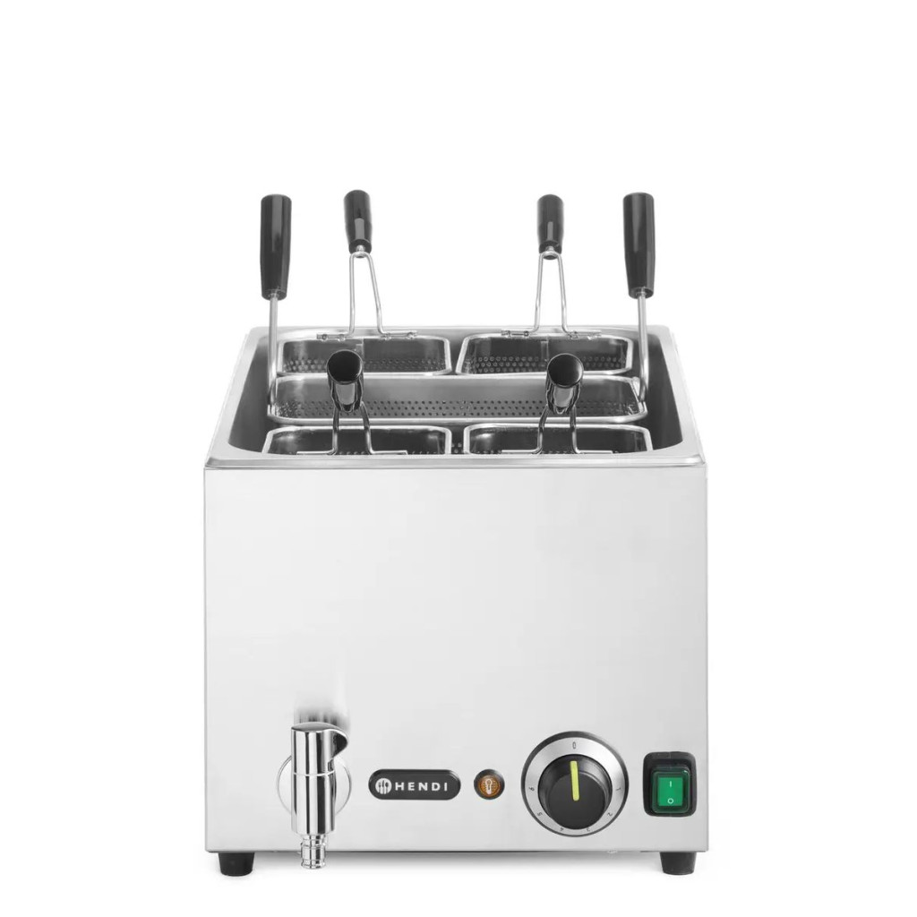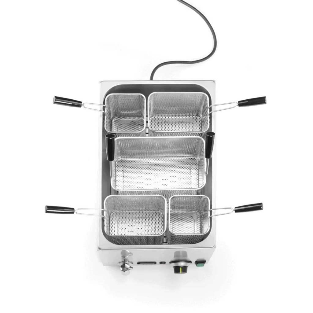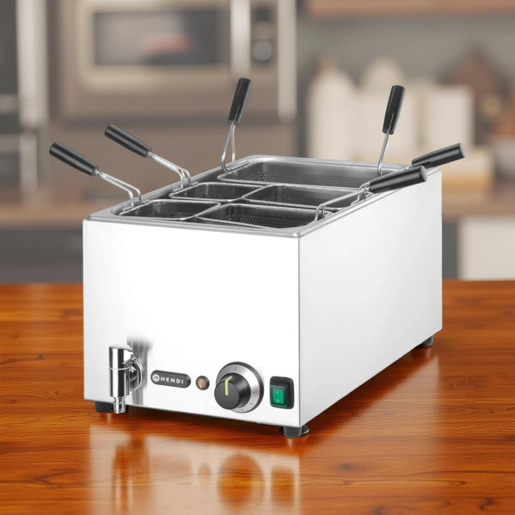 A HENDI tésztafőző 25 literes víztartállyal és tartós, 18/8-os rozsdamentes acél szerkezettel rendelkezik a tartály és a kosarak számára egyaránt, így hosszú élettartamot biztosít a kihívást jelentő konyhai környezetekben is. 5 sokoldalú kosárral szállítjuk – köztük 1 nagy, 2 közepes és 2 kicsi kosárral –, így egyszerre több tésztafélét is megfőzhet. A 45 °C és 110 °C közötti állítható hőmérséklet-tartomány precíz szabályozást tesz lehetővé a következetes sütési eredmények érdekében.
