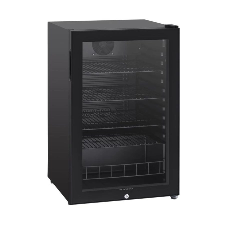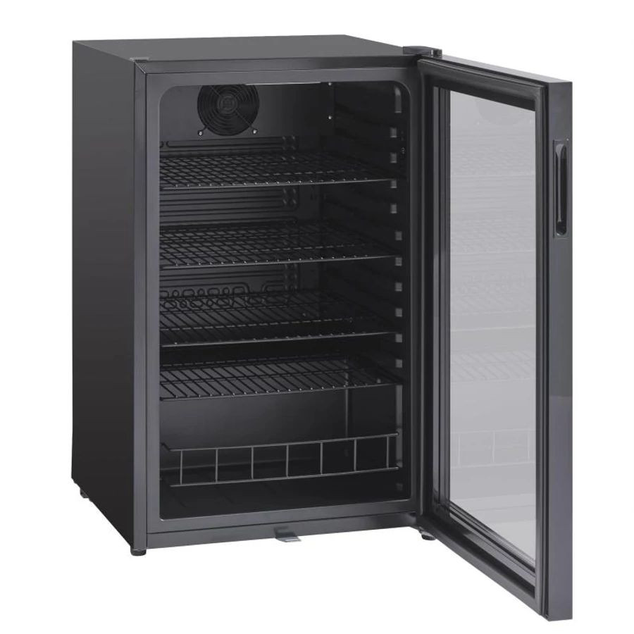 Üvegajtós hűtővitrin statikus hűtéssel (ventilátor rásegítéssel). A hűtővitrin kívül-belül fekete színű, 4 db fekete, állítható huzalpolccal rendelkezik. LED belső világítás. Elektronikus vezérlő. Modern külsejének és a krómozott polcainak jóvoltából ideális választás lehet elegánsabb vendéglátóipari egységek (pl. kávézók vagy cukrászdák) pultjaiba, vagy kisebb boltok pénztárgépei mellé. Zárható.