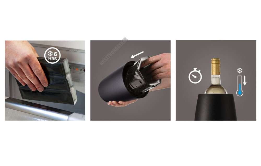 A borhűtő használata nagyon egyszerű, hiszen ezzel akár jég nélkül is le tudja hűteni kedvenc üveg italát. Az elegáns kivitelnek hála pedig még az étkező asztalon is remekül mutathat. Az alkalmazásához egyszerűen tárolja a mandzsettát a fagyasztóban, de legalább hat órával a használat előtt tegye oda be. Ez elősegíti a palack ideális hőmérsékletét.