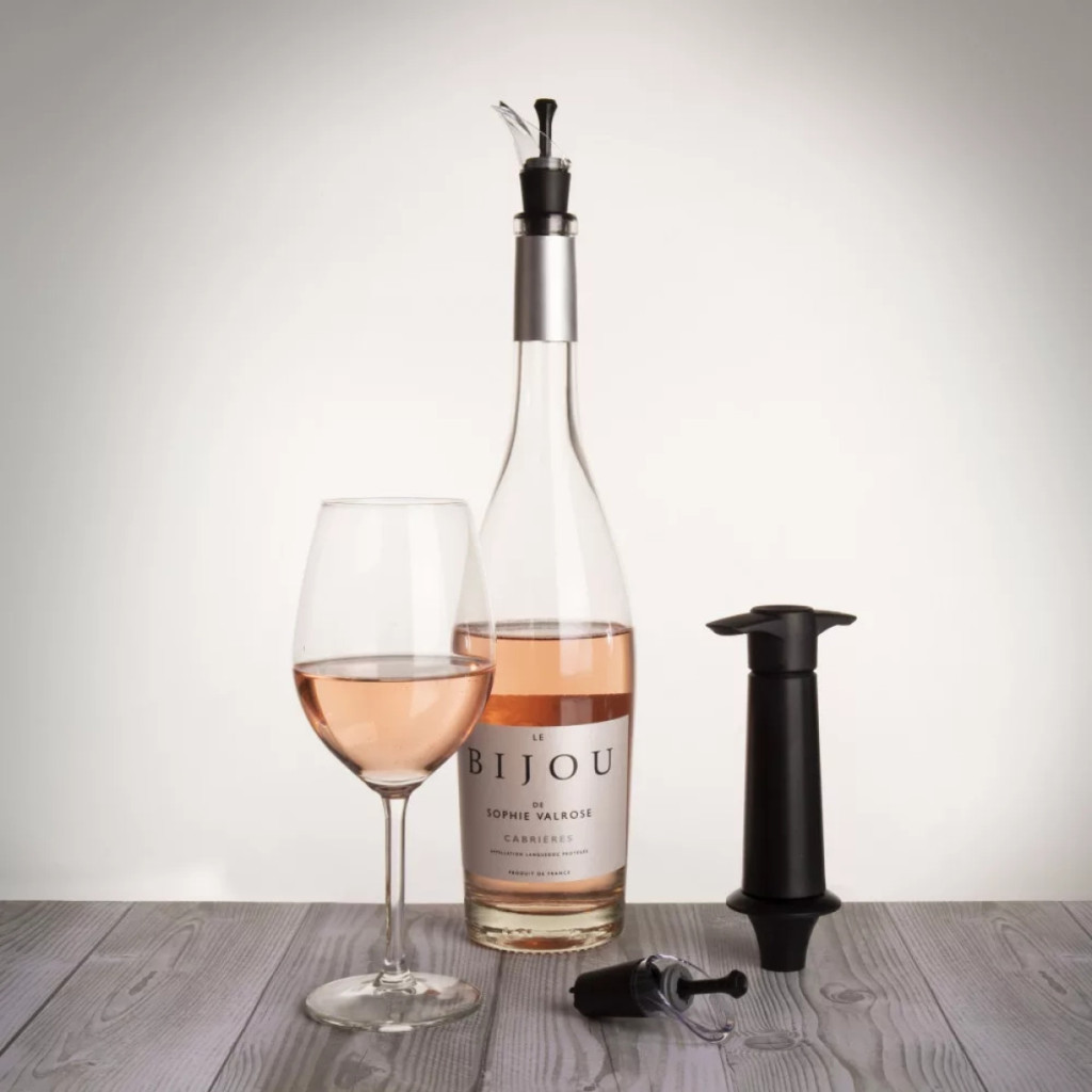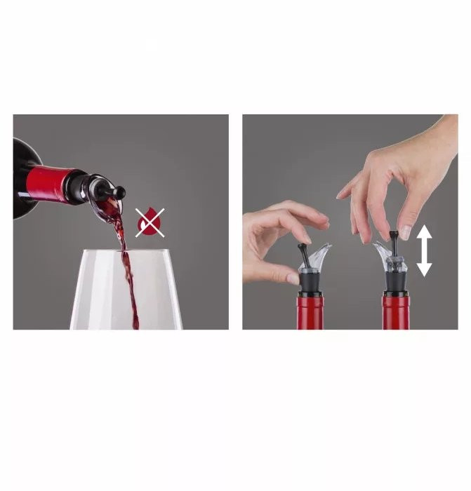 A körülményes borfelszolgálás és tárolás a múlté az egyedülálló vákuumdugó és borkiöntőnek köszönhetően. A bort csepegtetés nélkül tálalhatja a speciális kitöltőnek köszönhetően, amely elvezeti a cseppeket és visszafolyatja őket a palackba. Ezután zárja le a borosüveget légmentesen a beépített dugó lenyomásával és a hozzá tartozó vákuumpumpa használatával. Élvezze annak zamatát és frissességét a nyitástól számított 10 napig.